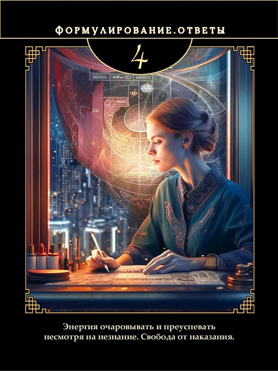 Главное знать нужное время для ответа, чтобы другие действительно заинтересовались, а не отвергли формулу. Важно дать себе время, понаблюдать, как Ум объединяет мысли, исследуя все теории, чтобы под запрос дать четкую формулу. Если у вас есть формула для решения чьих-либо проблем, это не обязательно означает, что другие хотят, чтобы вы сделали это для них! Своевременно данный ответ - в этом ваша сила. В этой энергии присутствует страх перед хаосом в жизни и отсутствием порядка. Может появиться психическое беспокойство из-за сомнений и необходимости как находить ответы, так и предоставлять ответы тем, кто ищет понимания.