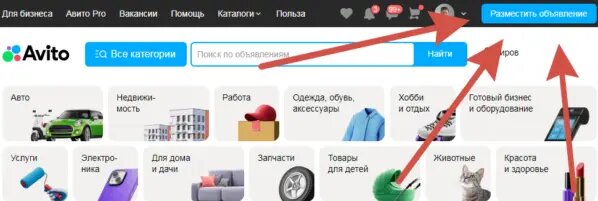 Заходим на авито, нажимаем “Разместить объявление” в верхнем правом углу