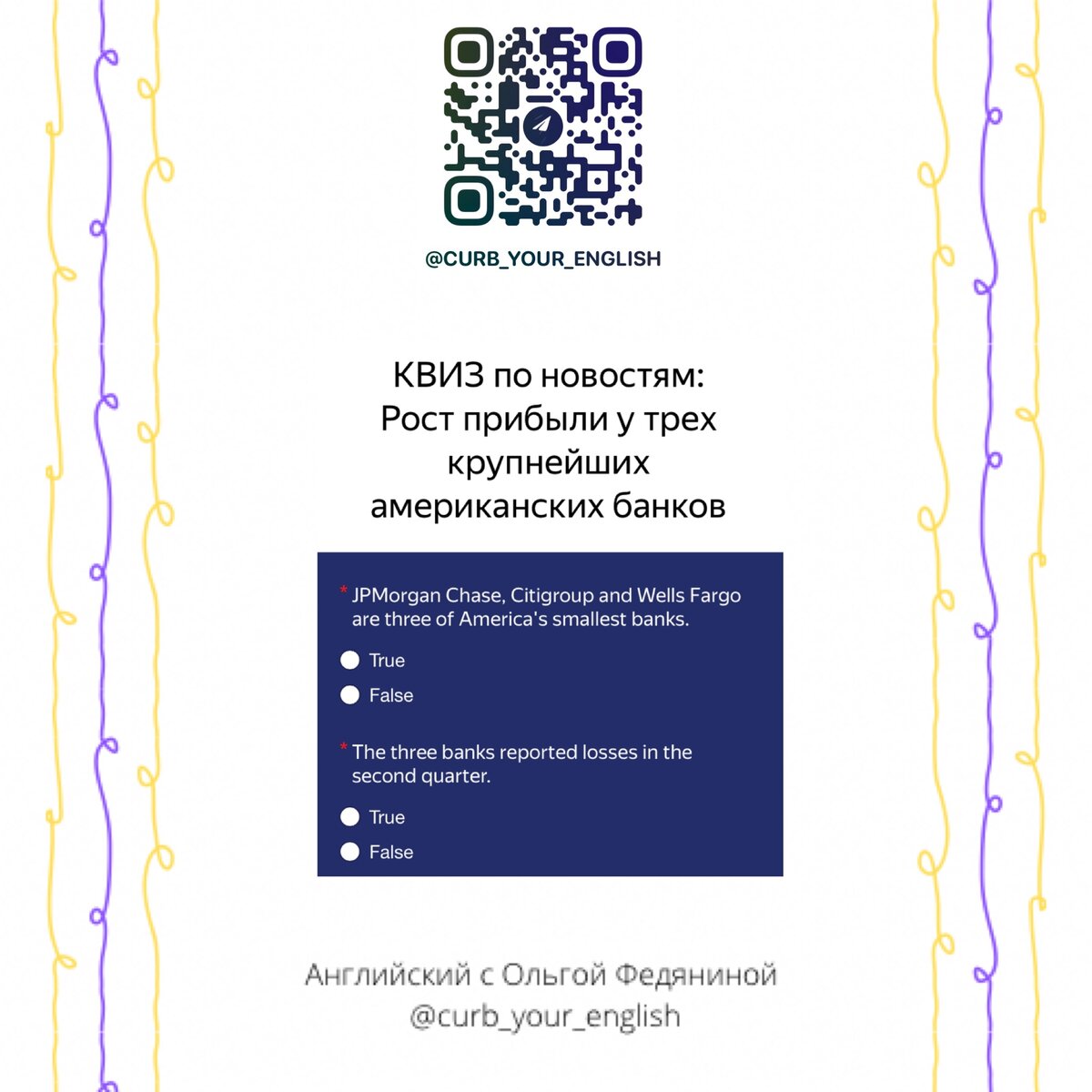 Прочитайте абзац из журнала The Economist и ответьте на вопросы TRUE/FALSE, чтобы понять, правильно ли вы поняли прочитанное. JPMorgan Chase, Citigroup and Wells Fargo, three of America’s biggest banks, reported bumper profits in the second quarter. They all benefitted from higher interest rates that propped up their lending businesses. JPMorgan Chase’s profits, which rose by 67% year on year, were also helped by its acquisition of First Republic Bank, a regional lender. Все ли слова из текста вам понятны? Я бы обратила внимание на следующие: bumper profits - баснословные/впечатляющие прибыли/ доходы to prop up - поддерживать А теперь перейдем к КВИЗу! Удачи! Ответь, верно/true или неверно/false утверждение. ЛАЙК 🔸 ПОДЕЛИТЕСЬ 🔸 ПОДДЕРЖИТЕ Like🔸Share🔸Support