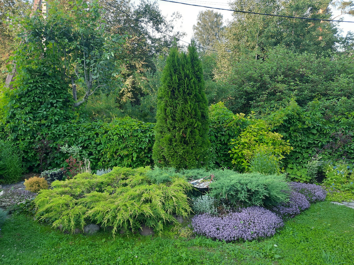Всем привет! Очередная неделя закончилась жарой и сушью. Попытки поливать вызывают у меня саркастическую гримассу... Толка мало! Ну, хоть что-то... Опять весь днь не было интернета. Урвала утром минут 15, успела ответить на комменты и все! И только к вечеру появился. А к нам нагрянули знакомые, приехали купаться. Всех отправила, помыла посуду и бегом поливать. Правда сунула нос в интернет, ответила, прочитала кое-что, прокомментировала. Так что сегодня опять коротко! Горка хвойная, одна из первых моих придумок. Правда была она тогда совсем другая. Кому интересно, в подборках все прописано с фотографиями просто детально! Общий вид. Фотографии сделаны в воскресенье вечером. Зеленый фон, заленая горка, а все такое разноцветное! Не сливается! Рассмотрим поподробнее, что там растет. Высотная доминанта - туя - начала активно расти в последние годы. И ввысь, и вширь. Рядом раньше росли можжевельники средние, но они погибли, новых не стала высаживать, да и правильно, было бы им тесно. Па