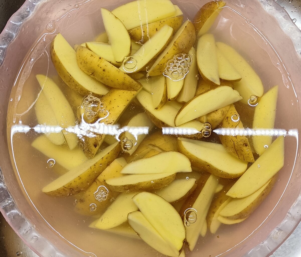 Картофель хорошо помыть от земли. Нарезать дольками и замочить в воде минут на 10, чтобы смылся крахмал.