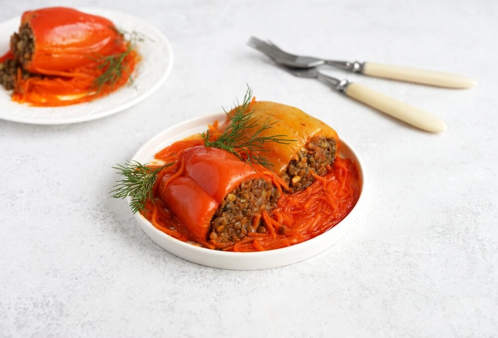 Фаршированные перцы с мясом - давно привычное для всех блюдо. Чтобы разнообразить повседневное меню, я готовлю постный вариант этого блюда - фаршированные чечевицей перцы по ПП рецепту. Да, его, не раздумывая, можно отнести к меню правильного питания. Такие перцы получаются вкусными, сочными и необычными. В них много пищевых волокон и растительного белка, который так необходим нашему организму. Такие перцы наверняка придутся по вкусу даже самым заядлым мясоедам, т. к. по структуре они очень напоминают мясные перцы. Общ.\актив. время готовки: 1 час\35 минут Количество порций: 6 порций Калорийность (100g): 85 ккал Стоимость: очень экономно Как приготовить фаршированные перцы: ПП рецепт с чечевицей Ингредиенты: Перец болгарский – 6 шт. Лук репчатый – 1 шт. Чеснок – 3 зуб. Морковь – 2 шт. Чечевица – 1 ст. (200 мл) Томатная паста – 1 ст.л. Вода – 1 ст. (200 мл) Укроп – 30 г Масло растительное – 60 г Соль – 2 щепотка (-и) Приготовление: Шаг 1 Подготовить все продукты для фаршированных