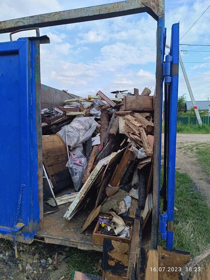Дмитрий набивает мусором по счету пятый 27-кубовый контейнер.