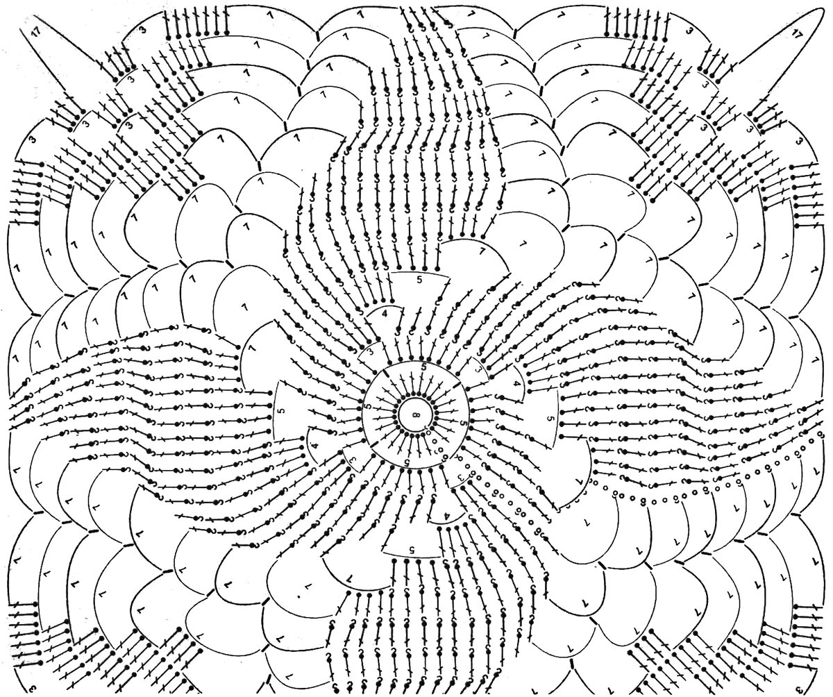 Этот мотив напоминает по своему рисунку детскую вертушку. Кажется что дует легкий ветерок и он как будто крутится под дуновением ветра. Есть разные вариации мотивов крючком, которые похожи на такие вертушки.