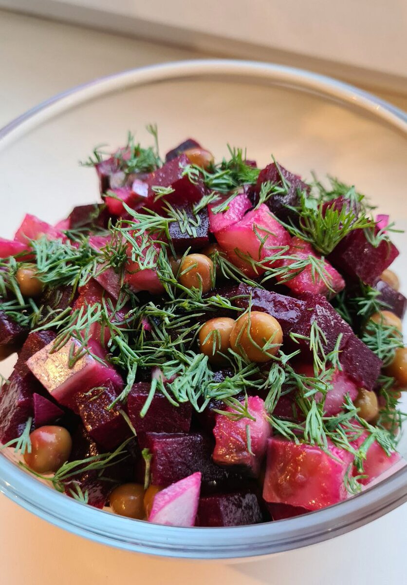 Вот рецепт необычного салата с сочетанием свеклы и селедки, который придаст вашему столу оригинальный вкус и яркий цвет Ингредиенты: 🌰Свекла 🐠Сельдь соленая 🧅Лук красный 🌿Укроп - Горох консервированный 🧂 Соль, перец 🧴Растительное масло Свеклу запекаем в духовке (180 градусов 40-50 мин), даём остыть, чистим. Нарезаем аккуратными кубиками. Мелко режем лук. Сельдь нарезаем аккуратными кусочками. Добавляем горошек. Солим, перчим, заправляем растительным маслом и перемешиваем. Выкладываем в салатник посыпаем укропом и подаём к столу. Приятного аппетита !!!