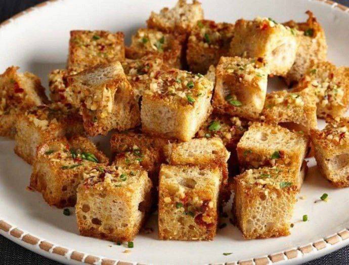 5. Как только гренки подсохнут и подрумянятся, вытянуть их из духовки и пересыпать на бумажное полотенце и дать остыть.