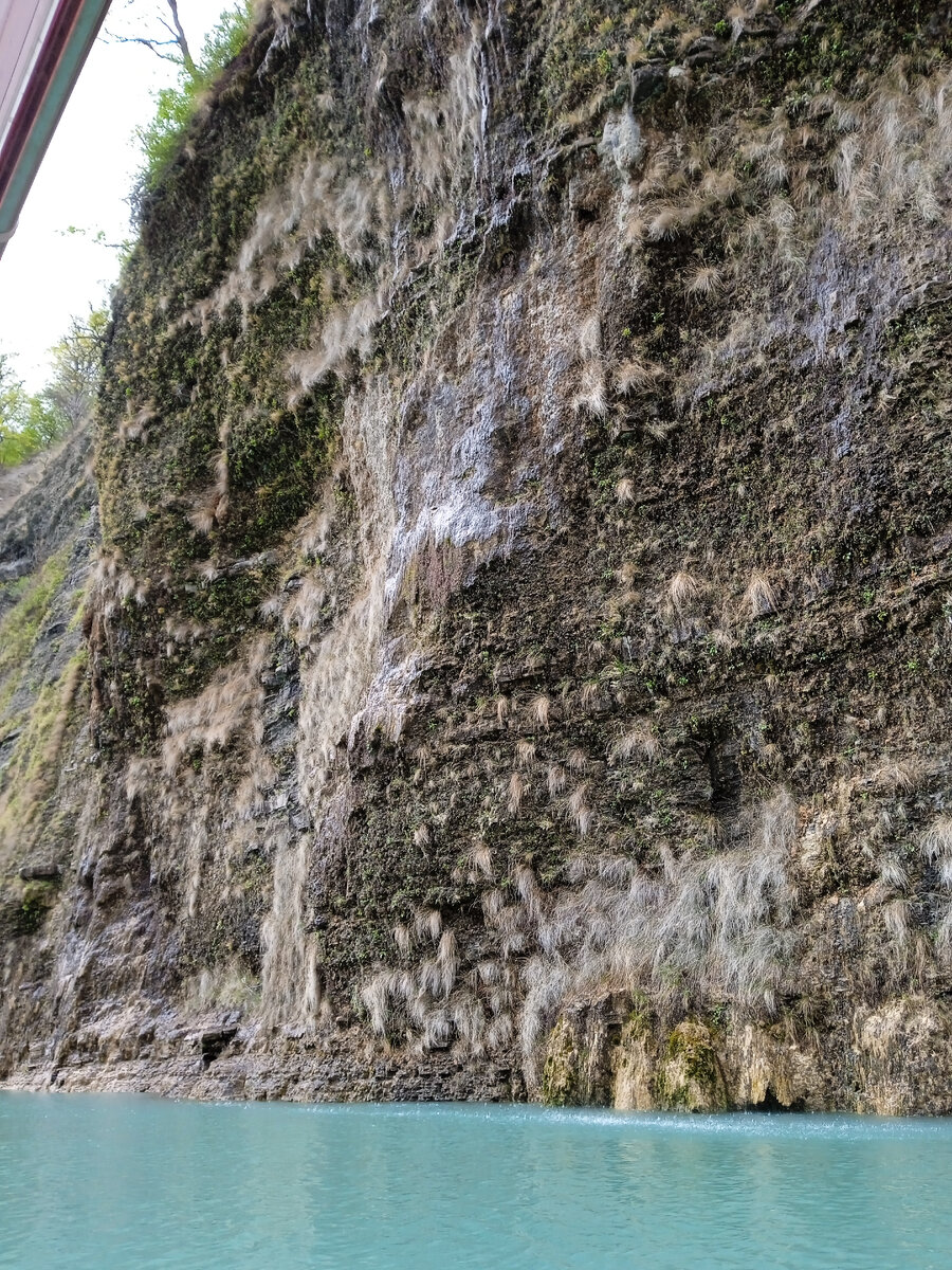 На одном из берегов в нише пасутся козы. По всему каньону небольшие водопады, похожие на чьи-то слёзы. На скалах профили людей и животных, скульптор природа. Виды очень красивые, один раз мы подъехали так близко к скале, что смогли в ладоши собирать эти восхитительные слёзы сверкающие на солнце, как бриллианты.