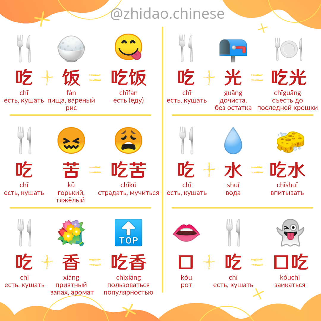 👉 #zhidao_разбор ⠀ Китайский язык достаточно логичный. Чтобы легко запомнить новое слово, можно разбить его на отдельные иероглифы. А еще интереснее учить слова, у которых есть общий иероглиф! ⠀ 🍴 Сегодня разбираем шесть новых слов с иероглифом 吃 chī - "есть"! 🔊 Открывайте видео и включайте звук, чтобы услышать, как произносится каждое слово! 📝 Ссылка на карточки Quizlet для изучения новых слов: 📚 Хотите, чтобы Вы или Ваш ребенок заговорили на китайском? Напишите нам для записи на групповые / индивидуальные занятия! 🎓