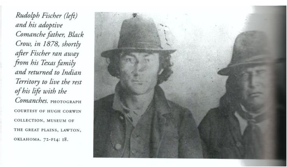 Рудольф Фишер (слева) со своим приемным команчским отцом Черной Вороной в 1878 году. Фото сделано вскоре после того, как Фишер сбежал из своей техасской семьи на Индейскую территорию, чтобы навсегда остаться с команчами. К этому времени, возможно, у него уже были индейская жена и двое детей.
