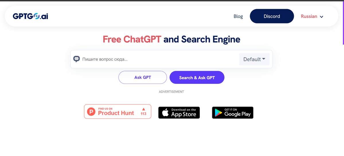 В наше время чат GPT - одно из лучших изобретений в интернете. Но к сожалению, официальный сайт чата GPT не работает в России, и у многих возникает вопрос: "А как пользоваться услугами нейросети?" Нашлось решение: GPTGO - 2 в 1, чат GPT вместе с поиском от Google. Это очень удобный сайт с множеством выборов языков. Сайт работает без ограничений по запросам чата GPT и все это абсолютно бесплатно! У них есть свое приложение на iOS/Android