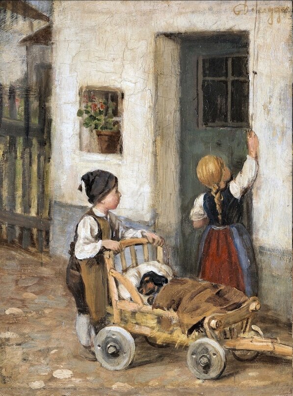 "Больная такса" Франца Дефреггера На картине художника Франца Дефреггера (1890 г.) изображено трое друзей, один из которых заболел. Маленькой таксе стало плохо и мальчик с девочкой повезли её к доктору, проявив максимальную заботу. На дно телеги они постелили солому, чтобы собаку меньше трясло на каменистой мостовой.