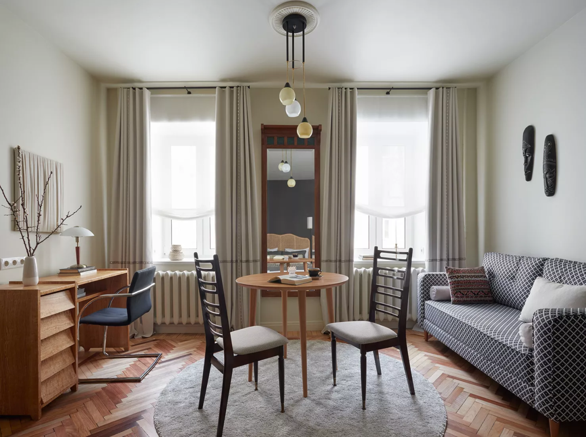 Квартира находится на Васильевском острове в здании XIX века. Заказчик приобрел ее под сдачу в аренду и хотел, чтобы интерьер одновременно выделялся среди других подобных квартир на бизнес-платформах и в то же время был нейтральным, производил благоприятное впечатление на гостя любого возраста. Изначальная планировка соответствовала цели покупки, поэтому в ходе работы Мария Нечаева ограничилась только переносом дверного проема в комнату, чтобы уместить шкафы по бокам от кровати. Несмотря на скромные размеры квартиры, здесь есть красиво оформленное спальное место, вместительные шкафы, рабочий стол, столовая зона и диван, как в полноценной гостиной. «Главной целью было малыми средствами и при этом быстро дать старой потрепанной квартире новую жизнь. Хотелось передать атмосферу Петербурга с налетом легкой ностальгии по разным историческим эпохам без лишней бутафории в виде искусственной лепнины и постараться сделать фотогеничным буквально каждый уголок, так как в современных реалиях это ч