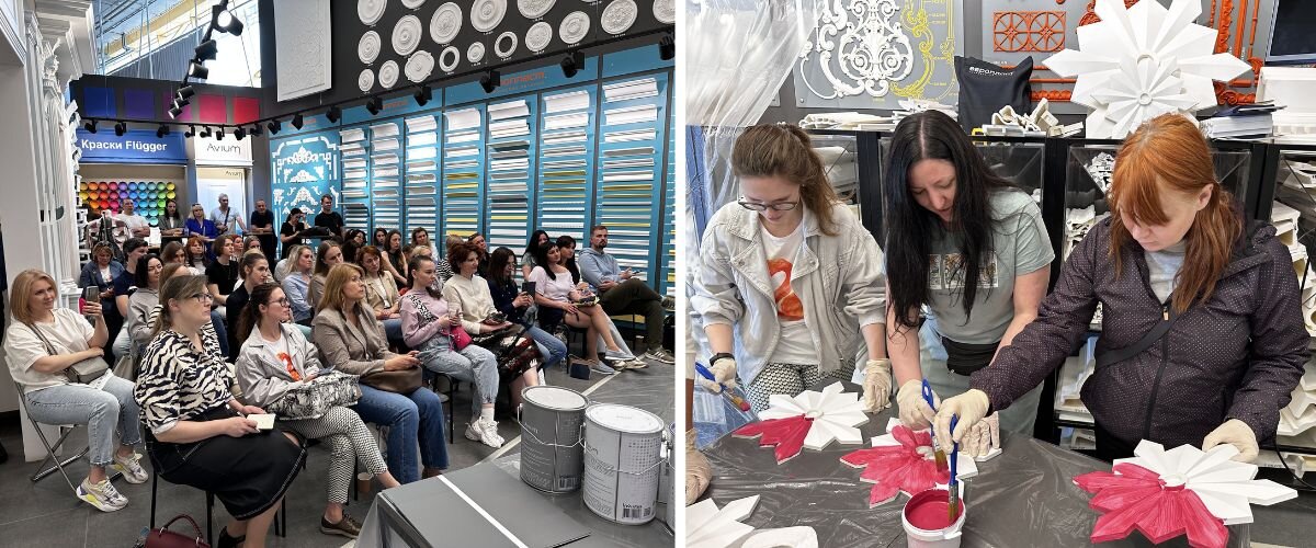 С удовольствием делимся с вами нашим опытом и полезными лайфхаками. Знаем, о чем говорим и что показываем, потому что за плечами двадцатилетний опыт работы с разными материалами. Поэтому Неделя дизайна в PITERRA — это не только теория, но и отработка практических навыков. Незабываемым аккордом мероприятий на Неделе дизайна PITERRA стали мастер-классы, посвященные нюансам работы с красками и лепниной.