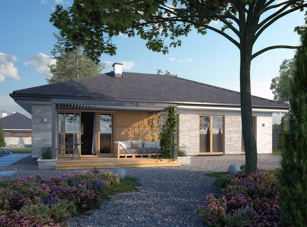 Проект одноэтажного дома вмещает в себя три спальни, в одной из них имеется гардеробная комната. Также в доме имеется просторный санузел, котельная под газ, продуктовая кладовая и большая кухня-гостиная с выходом на террасу. Материалом стен в доме служит газобетон толщиной 375мм, фундамент плитный, кровля вальмовая с покрытием мягкой битумной черепицей. Фасад дома выполнен в комбинированном стиле, тут используется микс штукатурки и панелей под камень и дерево. - Общая площадь - 99 м2
