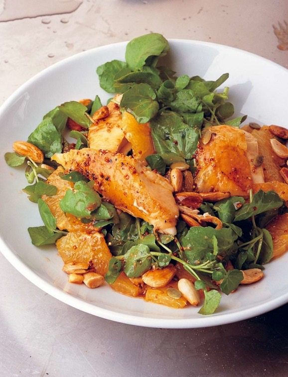Салат с курицей, водяным крессом, миндалем и апельсином