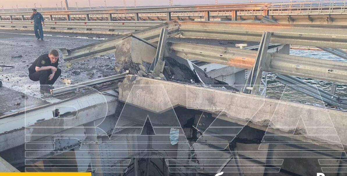 РБК Украины сообщает: атака на Крымский мост была совершена в ночь на понедельник с помощью надводных беспилотников в ходе совместной операции Службы безопасности Украины и ВМФ Украины. По сообщениям MASH незадолго до теракта в небе над мостом летал американский БПЛА, предположительно принадлежавший ВВС США. По словам губернатора Белгородской области, в результате теракта погибло двое гражданских, уроженцев Новооскольского района Белгородской области. Погибшие были простой семейной парой, которые ехали с ребенком на отдых в Крым. Девочка, ехавшая со своими родителями, получила тяжелую черепно-мозговую травму, сейчас она находится в реанимации. Ее родители погибли на месте. Местные паблики заявляют, что примерно в 3 ночи по местному времени в районе Керчи прогремело несколько взрывов. По заявлениям губернатора Крыма Сергея Аксенова, в результате атаки был частично разрушен пролет 145 опоры моста. Сейчас автомобильное движение по мосту остановлено. Также перестала работать и паромная пер
