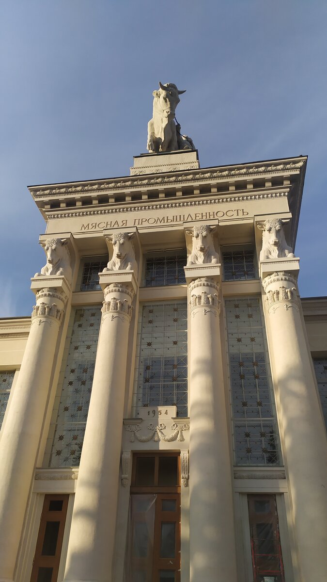 Каждый раз, бывая на ВДНХ, открываешь для себя что-то новое. Привлек огромный бык на фронтоне. Оказалось, что это Павильон "Мясная промышленность. Его возвели в 1951–1954 годах по проекту архитекторов В.М. Лисицына и С.Г. Чернобая. Здание было самым большим торговым павильоном ВСХВ. Здесь выставляли мясные изделия и демонстрировали изготовление мясных полуфабрикатов, а в залах располагались закусочно-дегустационная зона, магазин и даже столовая. До 1956 года павильон назывался «Главмясо», а затем его переименовали в «Мясную промышленность». Это название сохранилось и сегодня. Павильон пока на реставрации.