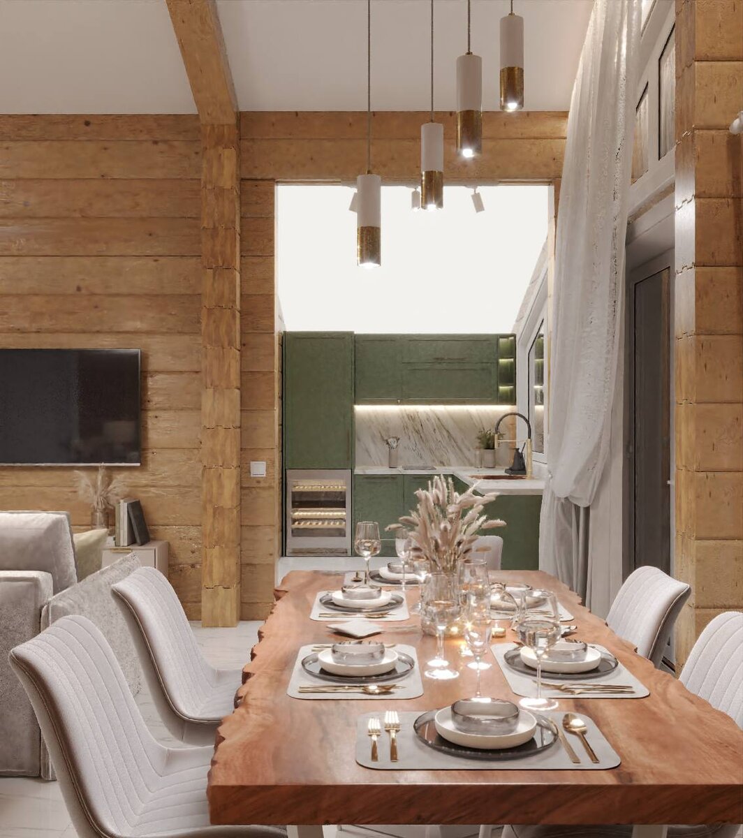 Дом из бревна — прекрасный выбор для тех, кто хочет создать уютную атмосферу и насладиться натуральной красотой уникального жилища. Но как оформить интерьер в коттедже из оцилиндрованного бревна, чтобы дизайн помещений выглядел гармонично и стильно? Выбираем цветовую гамму В первую очередь, стоит отдать предпочтение 🎨светлым оттенкам. Такая гамма зрительно расширяют пространство, добавляет света и простора в помещения. Однако, чтобы не создавать слишком однотонный дизайн, можно использовать контрастные элементы. Например, для пола можно выбрать темные породы древесины, которые выгодно контрастируют с натуральными оттенками шелка, ситца и льна — идеальных материалов для 🪑мебели и 🎗️текстиля. Особенности предметов интерьера Не стоит перегружать помещение громоздкой мебелью. Вместо этого, рекомендуется использовать: ✅легкие стулья; ✅мягкие кресла; ✅просторные диваны. Идеальная обивка мебели — натуральные ткани. Рекомендуется использовать хлопок, лен или шерсть. Также можно включить в