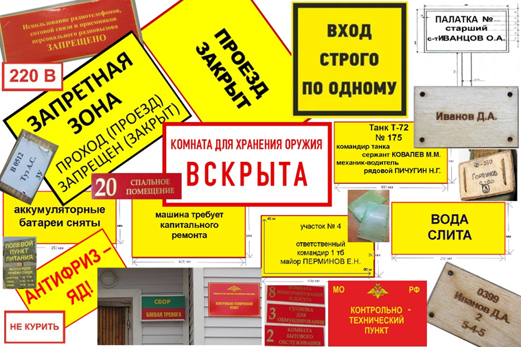 Экстраполируя данную поговорку на уровень всех вооружённых сил, можно поразится чудовищному количеству бирок, табличек, шильдиков, клеймений, вывесок, указателей и прочих поясняющих, запрещающих и идентифицирующих надписей, в силах этих плодящихся и живущих – в целях пресечения обезличивания и воровства, а также предупреждения, оповещения, запрещения и т.д. и т.п.