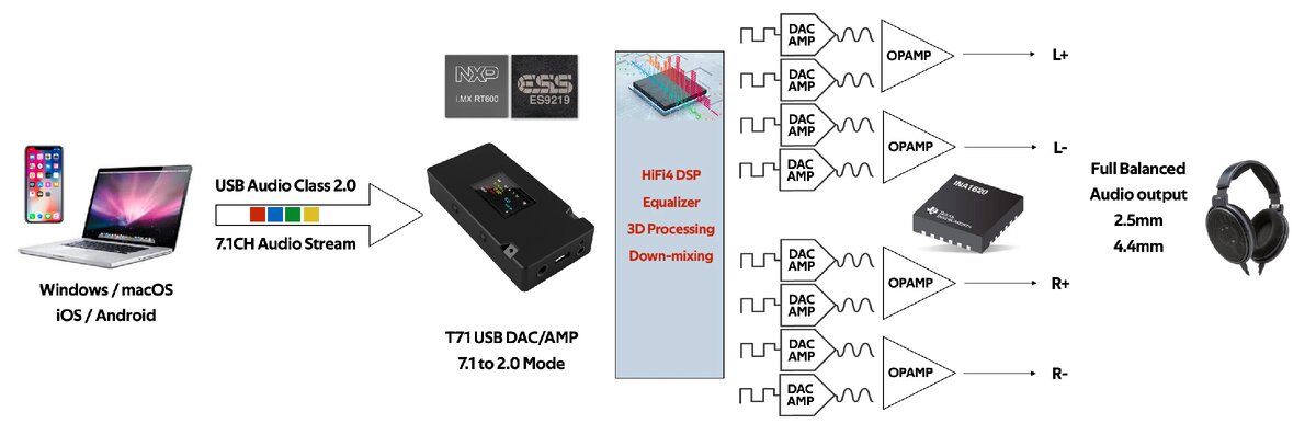 Конструкция T71 с четырьмя цифро-аналоговыми преобразователями ES9219 и двумя операционными усилителями INA1620 предполагает наличие высококачественной аудиосхемы, обеспечивающей мощное и оптимальное звучание любых наушников.