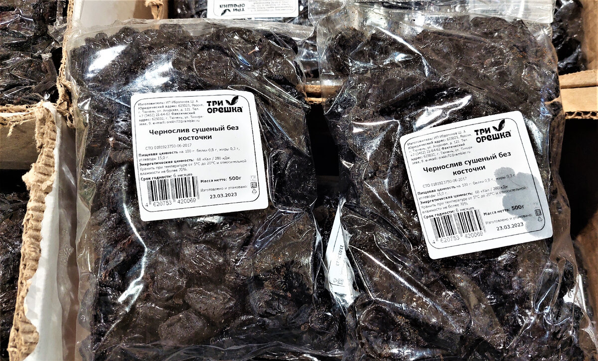 Показываю дома в упаковках, чернослив и виноград сушеный.
