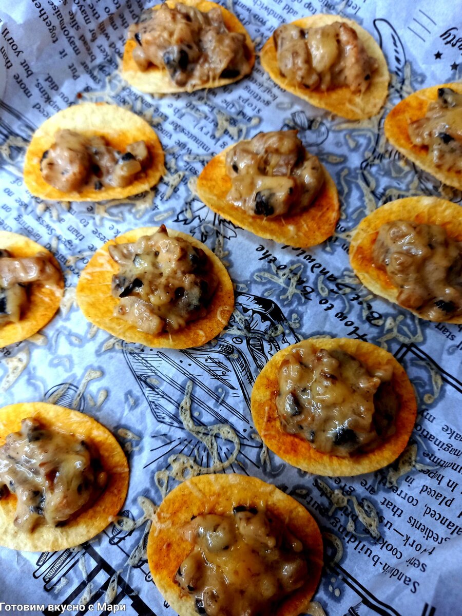 Чипсы перекладываем на противень на пергамент. По 0.5 ч.л. грибов выкладываем на чипсы, сверху посыпаем сырком и ставим в духовку на 5 минут. Закуска с грибами на чипсах готова.