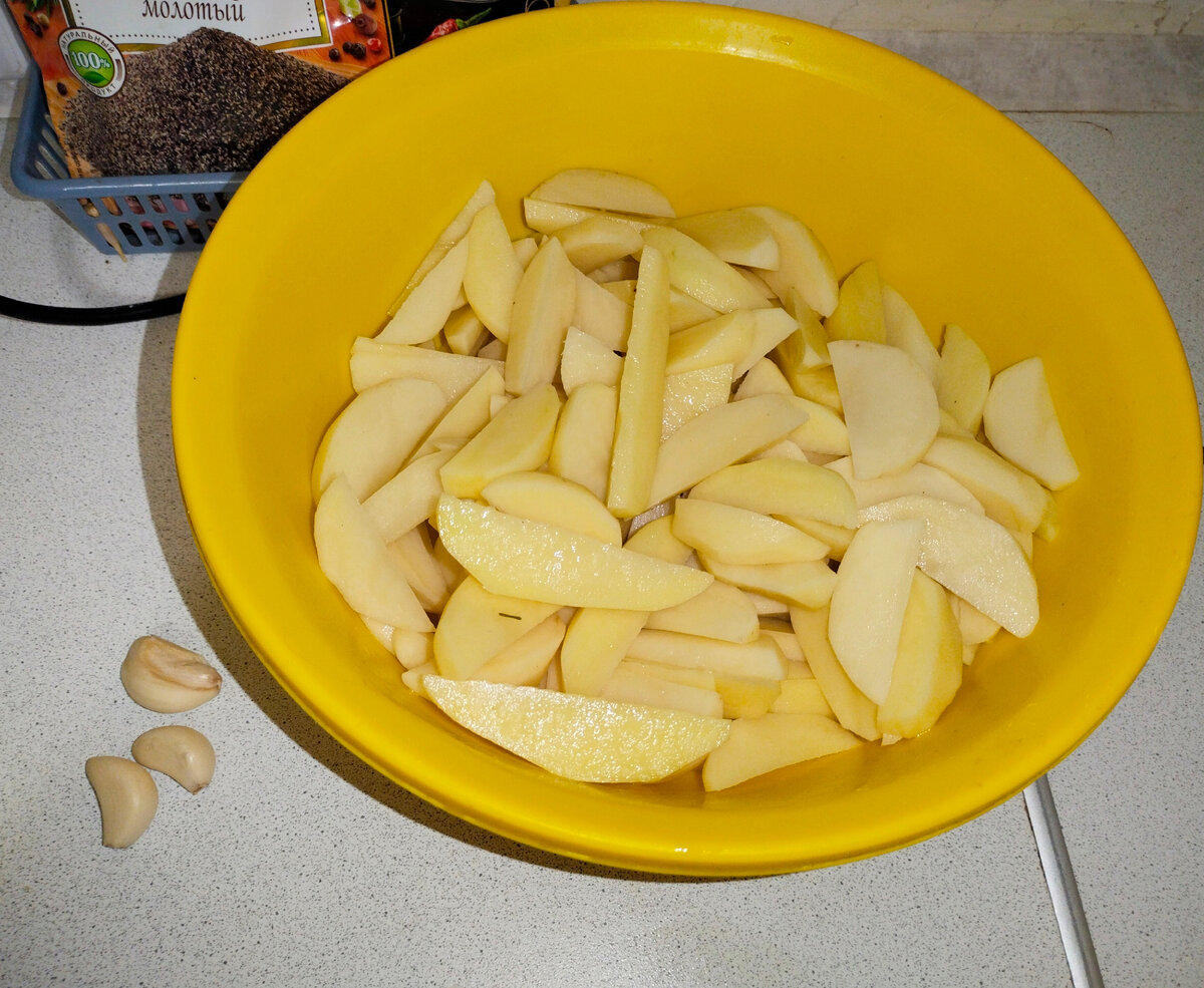 Простой рецепт, который повторит даже новичок в кулинарии. 1. Подготовить картофель, почистить и нарезать дольками. Для крупных долек используйте картофель крупного размера, у меня была только мелкая. 2. Подготовьте заправку. Немного майонеза, чеснок, соль и любимые специи. Можно заменить сметаной. Заправка должна быть достаточной солёной, иначе картошка получится недосоленной. 3. Размешать заправку, переложить к картофелю и хорошо перемешать. 4. Выложить на противень, убрать в духовку на 200°. Примерно через 30 минут проверяю, картошка уже мягкая, натыкается, остаётся подождать небольшой корочки. Важно: духовка у всех разная, я на 200° готовлю примерно 40 минут. У вас время может различаться. 5. Перед подачей присыпаю любимыми травами. Все, простой гарнир готов! А ещё можно использовать как отличный перекус на пикнике, ведь такая картошка вкусная и холодная, и горячая. Если делаете картофель в духовке на закуску к застолью, то лучше делать крупные дольки и подавать их с