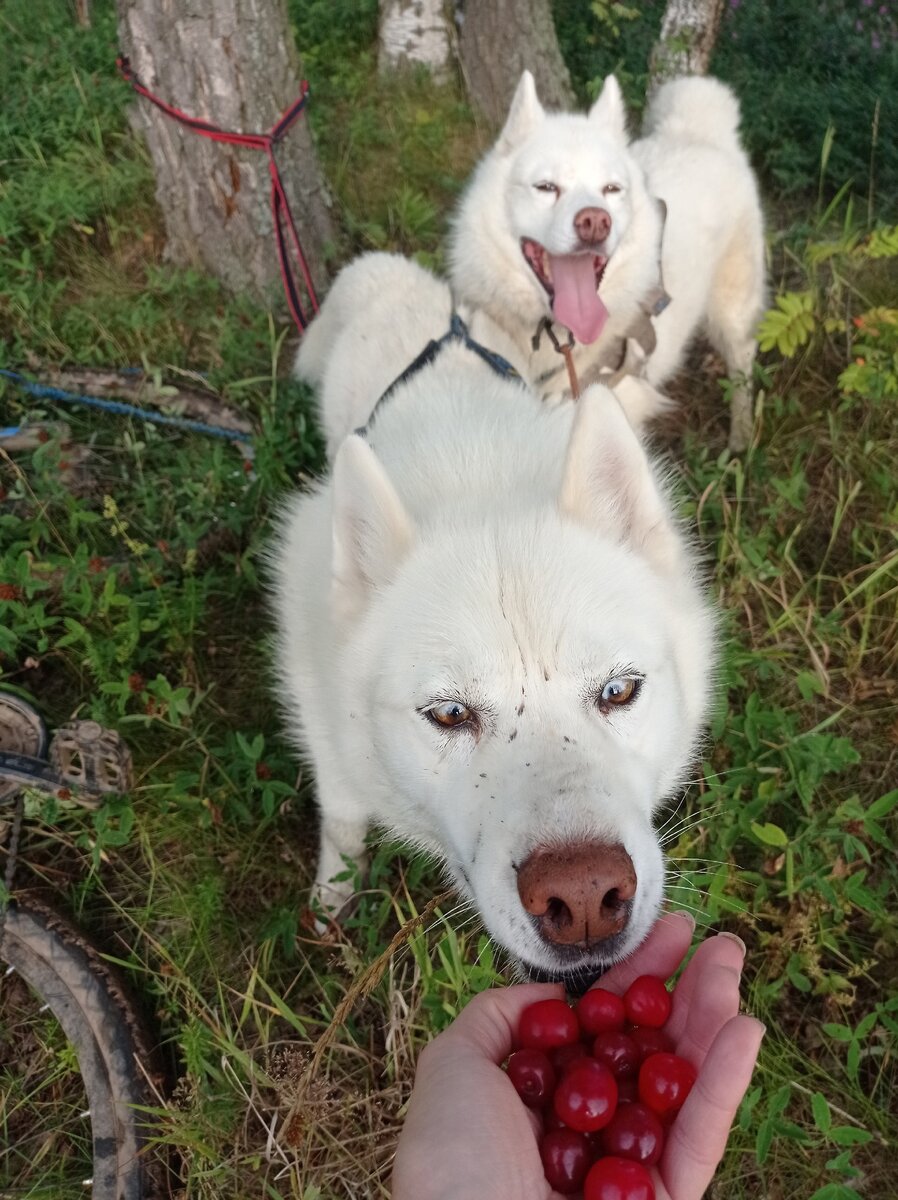 Каталась я недавно на велосипеде с собаками среди злаково-кукурузных полей и внезапно обнаружила дикую вишню. Естественно, положила на нее глаз, но сразу, «по пути», собрать ее дары не могла. Во-первых, было не во что. Во-вторых, росла она в нескольких метрах от дороги, а велосипед в отличие от нарт никак не якорится, при том что сдвинуть его даже в лежачем положении для двух наших собак совсем не проблема. Ладно если бы просто сдвинуть! Передвигаться с ним (причем довольно шустро) они тоже могут без каких-либо особых сложностей. Да, не то чтобы прям очень быстро. Да, с таким «прицепом» сзади у меня всегда есть возможность их догнать, даже если они вдруг решают поймать внезапно выбежавшую лису или поучаствовать в какой-то моей деятельности (например, помочь собрать ягоды). Но мне как-то не хотелось устраивать дополнительные испытания на прочность моему и без того многострадальному велосипеду. Так что, увидев тогда вишню, я просто запланировала, что когда-нибудь специально поеду за ней,