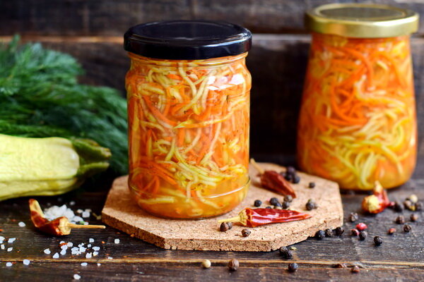 Кто уже вдоволь наелся кабачковых оладушек и запеканок, предлагаю хороший проверенный рецепт салата из кабачков на зиму «по-корейски». Делается элементарно, хранится отлично, вкусно очень, одна беда – до зимы иногда съедается. Но ничего! Чтобы заготовить припасы на зиму, времени ещё предостаточно. Для этого рецепта кожуру кабачка, если она не толстая и не поврежденная, не удаляем. Не используем только мягкую середину с семечками. Ингредиенты: Приготовление: Овощи хорошо промываем, обсушиваем, морковь чистим. Кабачок трем на терке для корейской моркови. Также трем морковь и добавляем к кабачкам. Чеснок чистим, трем на мелкой терке или пропускаем через специальный пресс. Добавляем приправу для корейской моркови. Также добавляем соль, сахар, уксус и растительное масло. Салат хорошо перемешиваем. В таком виде оставляем примерно на час, овощи пустят сок и немного промаринуются. Тем временем стерилизуем банки и крышки любым удобным вам способом. Через указанное время раскладываем салат к