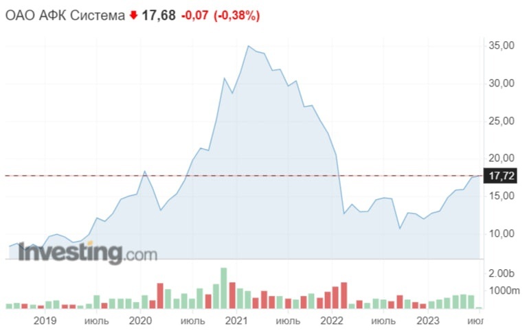 АФК «Система» — российская инвестиционная компания. Вкладывает средства и управляет деятельностью компаний в различных секторах экономики: телекоммуникации, розничная торговля, высокие технологии, финансы, лесная промышленность, коммунальный сектор, фармацевтическая промышленность, здравоохранение, с/х, недвижимость и туризм. Тикер: AFKS Индустрия: Инвестиционный холдинг Сектор: Финансы Главные плюсы компании: 1. Стоимость долей АФК «Система» в публичных “дочках”: МТС — 287,0 млрд руб.; Озон — 139,2 млрд руб.; Эталон — 15,7 млрд руб.; Сегежа — 41,3 млрд руб. Итого — 483,2 млрд руб. Рыночная капитализация АФК «Система» — 167,3 млрд руб. Получается, что акции МТС, Озона, Эталона, Сегежи вы покупаете через АФК «Система» со скидкой около 65%. И это не считая доли в непубличных компаниях. 2. Компания выше ожиданий отчиталась за 1 кв. 2023 г. У компании выросла выручка и OIBDA. Рентабельность компании улучшилась из-за роста выручки большинства дочерних компаний на