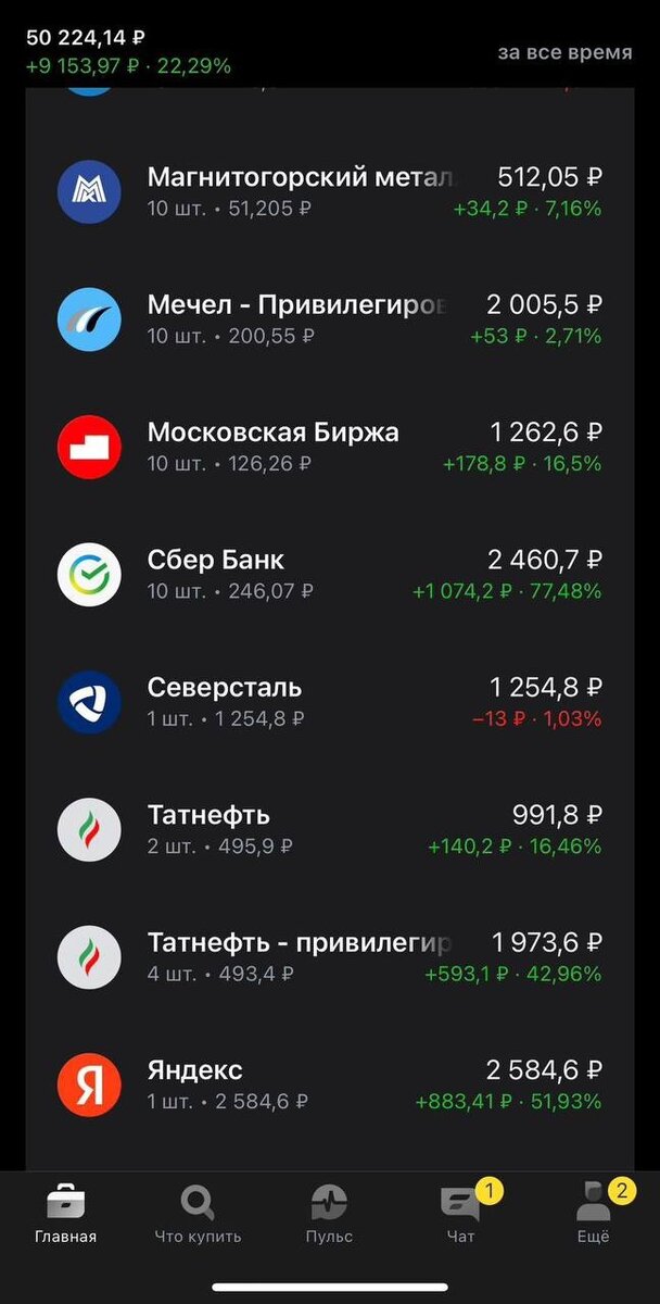 Скажу сразу, что с моей стороны это был некий эксперимент, я не напоминал супруге про инвестиции, не подсказывал что покупать и не говорил про необходимость периодического пополнения портфеля, а просто наблюдал. Да, я бы мог активничать в этом направлении целый год, но зачем вам очередная история успеха сделанная чужими руками? Я предполагал, что будет происходить с портфелем, как это часто происходит у новичков, но так как я занимаюсь обучением, мне в очередной раз хотелось проверить мои выводы и обсудить их с вами на реальном примере. Итоговый результат портфеля в деньгах и доходности Вы видите на скринах. Доходность неплохая, закуп был после открытия биржи в марте-апреле 2022 г., поэтому практически все в плюсе. После первого пополнения счета на 20 тр., портфель пополнялся еще пару раз в течение месяца и сразу совершались покупки активов. После этого пополнений не было. В активах акции 10 различных компаний РФ из разных секторов экономики и немного валюты. Итогова