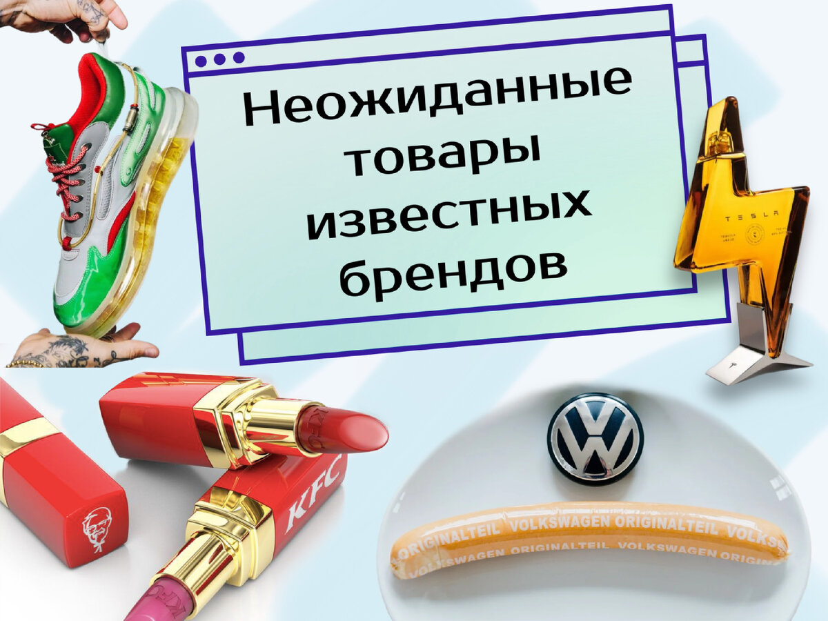 Кроссовки Heineken Компания Heineken выпустила кроссовки с настоящим светлым пивом в подошве, придающим легкий манящий аромат пенного напитка и ощущение мягкой амортизации при ходьбе. Кстати, в язычке кроссовка спрятана открывашка. Мороженое и шоколадно-кетчупные конфеты от Heinz Heinz выпустила интересные конфеты ко дню святого Валентина со вкусом шоколада и кетчупа в коробке в виде сердца. А также невероятные наборы для самостоятельного приготовления мороженого со вкусом кетчупа, майонеза, салата, барбекю и острого соуса. Помада KFC Помада со вкусом острых куриных крылышек исключительно красного цвета и остаётся на губах даже после сытного обеда Мёд Porsche В 2017 году компания Porsche приютила у себя на территории завода в Лейпциге 25 пчелиных колоний. Результатом тому стал новый продукт, который можно купить в магазинчике при этом заводе. Текила Tesla "Tesla Tequila" - "Представляем Tesla Tequila, эксклюзивную текилу аньехо из 100% агавы премиум-класса, выдержанную в бочках