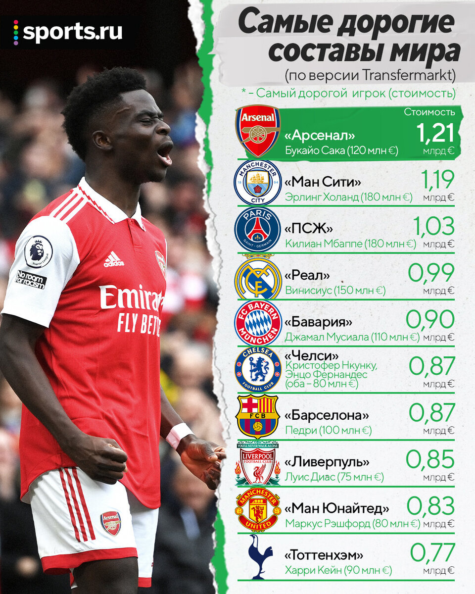 АПЛ доминирует. В летнее межсезонье традиционно меняются составы, вместе с тем и их общие стоимости. После трансфера Деклана Райса из «Вест Хэма» в «Арсенал» команда Микеля Артеты внезапно стала лидером! Важно: под стоимостью подразумевается оценка Transfermarkt. Несколько наблюдений. • «Арсенал» выделяется не только Райсом, которого Transfermarkt оценивает в 90 млн евро. Другие новички тоже оцениваются высоко: Кай Хавертц (55 млн евро) и Юрриен Тимбер (42 млн евро). Всего у «Арсенала» аж 12 игроков, которых Transfermarkt оценивает в 40 и более миллионов. • Шесть из десяти клубов представляют АПЛ – суммарная стоимость «Арсенала», «Ман Сити», «Челси», «Ливерпуля», «МЮ» и «Тоттенхэма» превышает 5,5 млрд евро. • В первой десятке есть представители четырех европейских топ-лиг – не хватает Серии А. Итальянские клубы немного не добрались до десятки – состав «Наполи» стоит 629 млн евро и занимает 11-е место в общем рейтинге. • В составе «Реала» четыре игрока оцениваются в 100+ млн евро –
