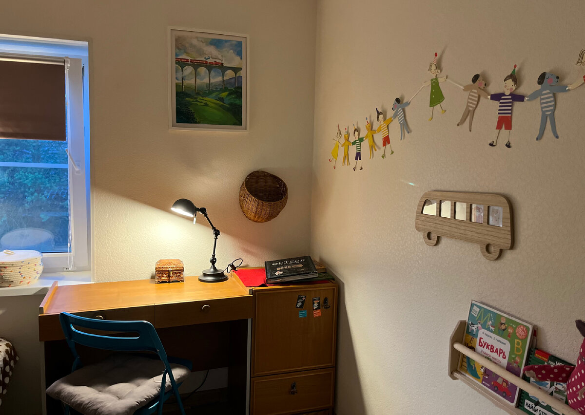 Записки Евгении… как же хорошо стало в детской комнате. Люблю наш дом. Продолжаю наводить уют в детской комнате. Поставила себе такую цель и по чуть-чуть двигаюсь в нужном направлении. Я уже показывала вам в другой своей статье, какой коврик купила в детскую на лето. Также там показала новую настольную лампу (ссылка тут). Сейчас продолжаю дополнять комнату функциональным декором. Таким, чтобы и красиво и практично. 1. Автобус, рамка для фото В этот раз подключилась подруга, знает, что я люблю. Подарила нам вот такой семейный авто, где в окнах зверюшки. С обратной стороны все окошки открываются и можно вставить туда наши фото. Не знаю, когда я доберусь до этого и распечатаю таки фото. Но на самом деле мне и так нравится как смотрится. Автобус хорошо подошел к нашей полке для книг. Пусть пока со зверушками висит. Подруга поделилась ссылкой, она покапала эту рамку в Максидоме - ССЫЛКА ТУТ 2. Бумажная гирлянда Над автобусом разместилась бумажная гирлянда. Веселая, яркая и добрая.