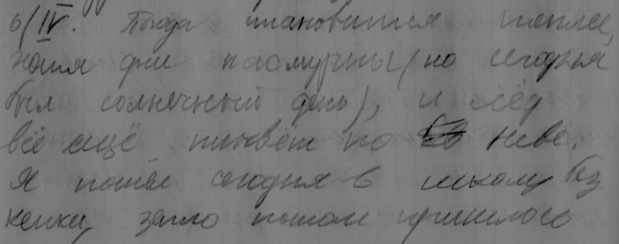 Погода в эти дни стоит чудесная. Вода в нашем ручье теплая, что даже можно по ней ходить. Но в Неве еще холодная. Ведь лед только сегодня кончил идти. Теперь все подсыхает, пора копать огороды. Придя со школы, я пообедал и пошел таскать к Неве мусор из огорода. Потом гулял до 5-ти часов. Сделал уроки, начал чертить расписание экзаменов, которое нам с Толей поручил завуч. Пришло время включать телевизор. Сначала было кино «Человек идет по следу». В нем говорилось о жизни соболей, о их приручении и размножении в неволе. Потом была кинокомедия «Близнецы», но на кинокомедию не похоже, мало смешного. Но все же интересная. Вечером, после кино, мы трое: Витька, Женька и я пошли гулять по проспекту, потому, что вечер был очень уж хорош. Зато потом мама ругалась, что пришел поздно.