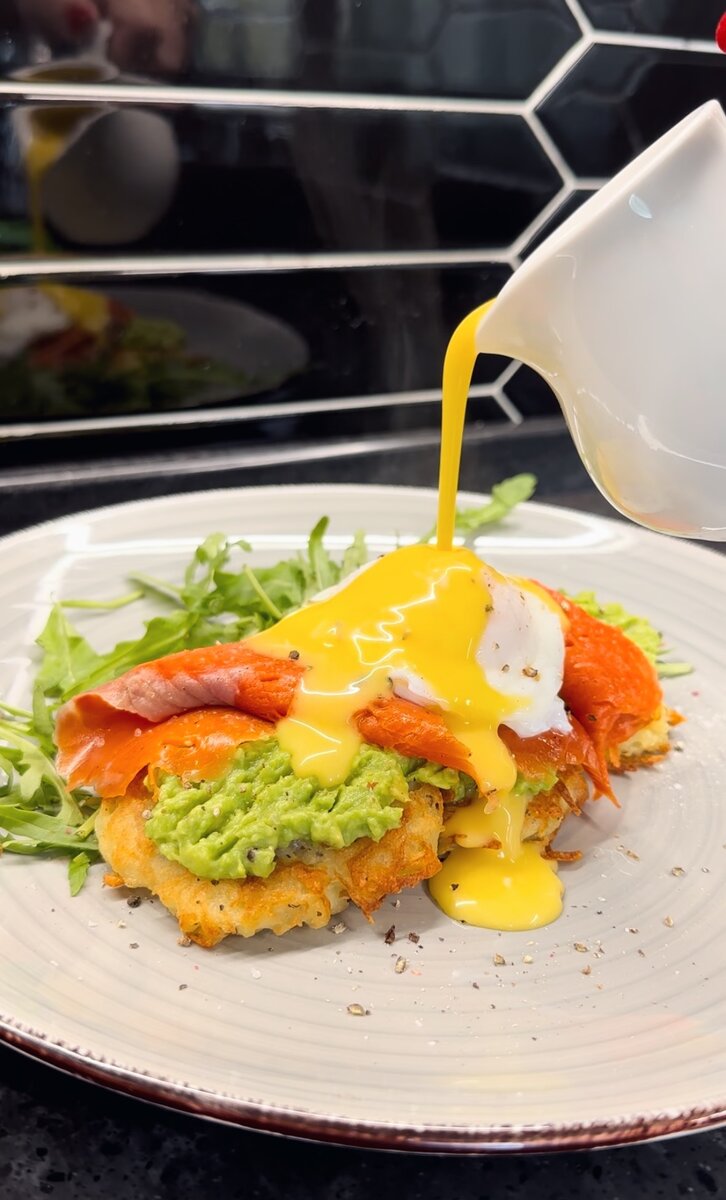 Несколько пунктов, благодаря которым приготовление пашота станет простым и понятным: 1.Довести воду до кипения в маленькой кастрюльке, а затем убавить до среднего огня, чтобы не было очевидного бурления воды. 2.Я разбиваю яйцо сначала в маленький стаканчик (или в рюмку), потом закручиваю столовой ложкой воронку и в её центр вливаю яйцо. 3.Ставлю секундомер на 2 минуты 30 секунд. 4.По истечению времени достаю шумовкой яйцо и выкладываю на тарелку, чтобы вода стекла и не портила драники лишней влагой. Драники картофельные: Включить нагреваться духовку до 180 градусов. Картофель натереть на тёрке и отжать лишнюю влагу. Добавить все наши ингредиенты и как следует смешать. Разогреть сковороду с кокосовым маслом и обжарить наши драники по паре минут с каждой стороны до золотистого цвета. Выложить на пергамент на противень и отправить в духовку на 15-20 минут. Пока драники готовятся, размять авокадо вилкой, добавить немного лимонного сока, соль/перец и перемешать. Голландский соус: