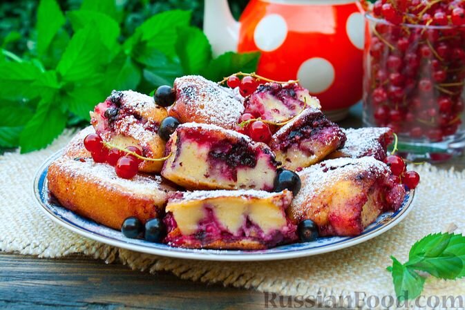 Кайзершмаррн со смородиной. Брауни с кабачками. Луковый пирог-запеканка с сосисками и сыром. Картофельный пирог с фаршем и яйцами. Пирог с творогом и черешней.