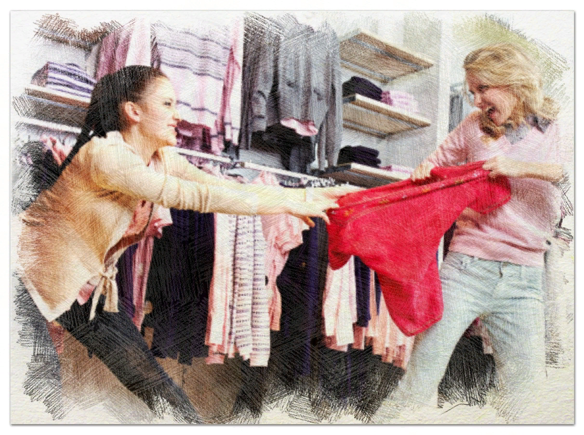 Стоило нам вместе оказаться в магазине, сразу же возникала опасная ситуация, грозящая в любой момент обернуться чуть ли не дракой из-за приглянувшейся нам двоим одной пары обуви или сумочки.