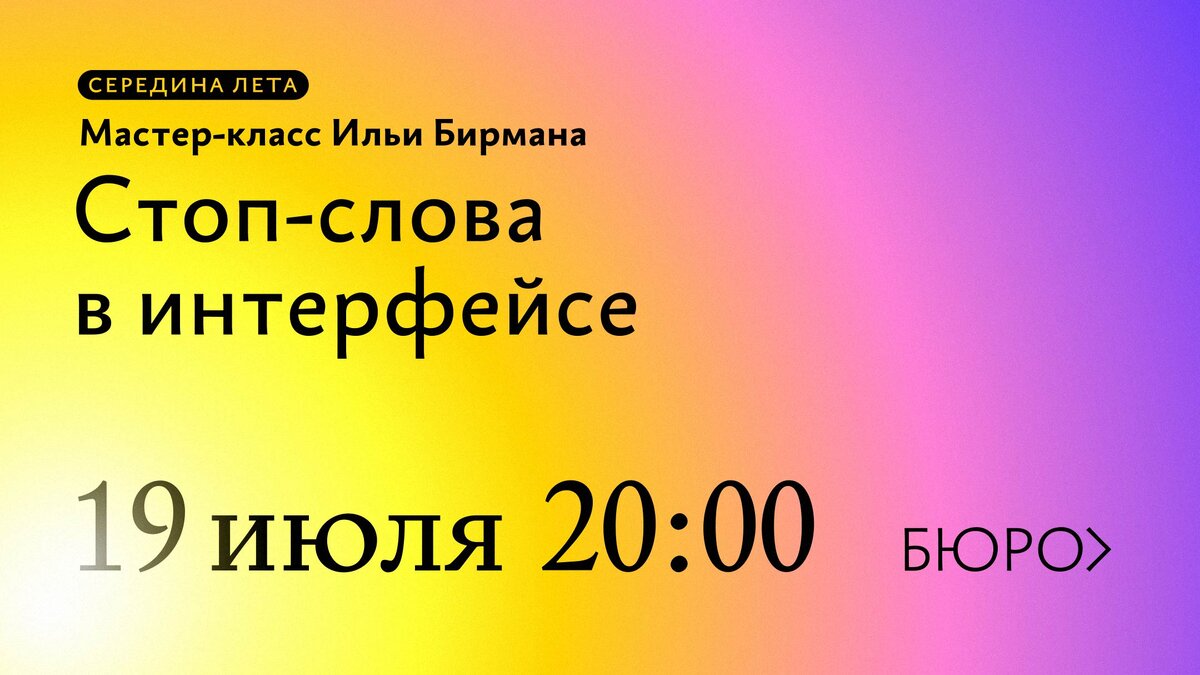 В среду 19 июля в 20:00 мск арт‑директор бюро, автор книг и преподаватель дисциплины «Интерфейс и информация», Илья Бирман проведёт бесплатный мастер‑класс о стоп‑словах в интерфейсе, а участники смогут задать вопросы.
