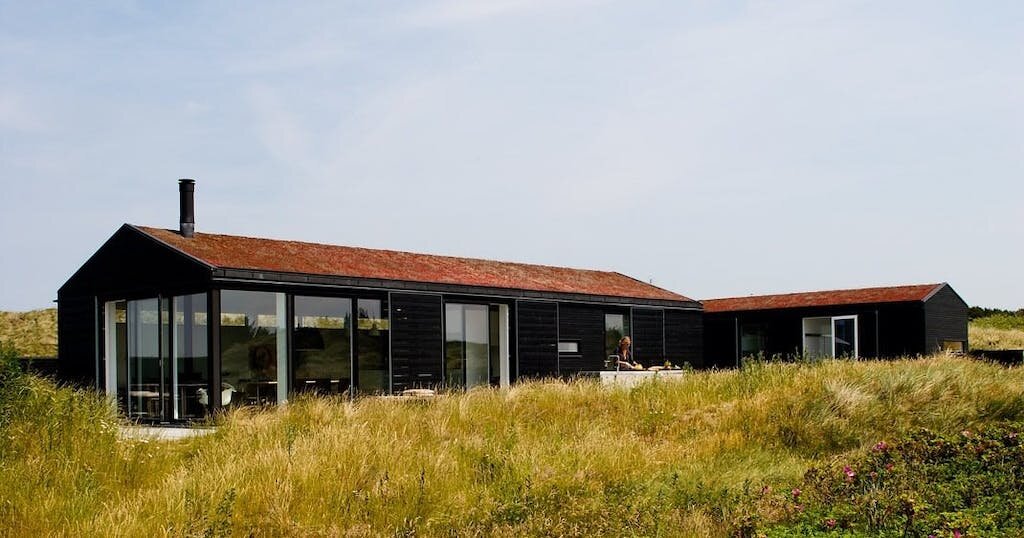 Окрашенные в черный цвет перила вокруг фасада дома образуют укрытие и защищают эту часть дома от ветра и непогоды. У большинства старых летних домиков в округе крыша покрыта дерном, но в доме Марианны и Хенрика Бисгаард растет седум - смесь суккулентов красивого красноватого цвета.