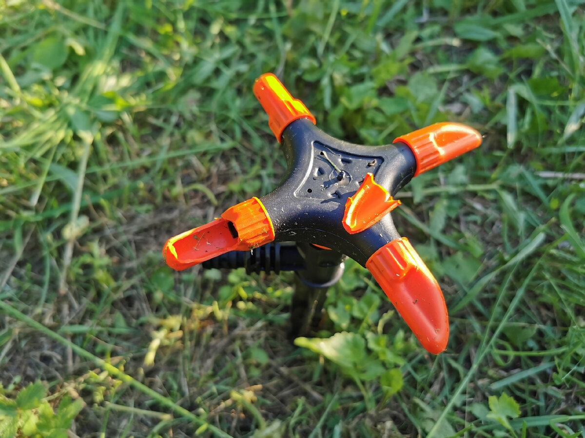 Это лето вышло достаточно сухим, поэтому у многих, кто владеет огородом с посадками, начались проблемы с засухой. Не у всех есть возможность приезжать на огород и поливать растения. Но есть способы, которые могут упростить эту задачу без участия владельца участка. 1. Вертушка поливная. О ней знают все. Воткнул шланг, притянул хомутом, в шланге только давление ставить на максимум не надо, а то вырвет шланг или поломает вертушку. Вообще сломать вертушку сложно, но если она сделана очень из некачественного пластика, то ломается она чуть ли не сразу. Та, что на фото была куплена за 80руб. Хватило на один раз. Что бы был больше охват территории, вертушку можно закрепить на палку высотой в полтора метра.