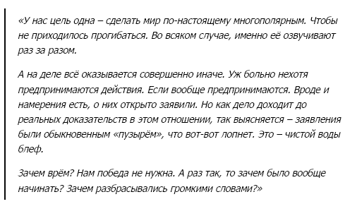 Мне кажется, Евгений Сатановский абсолютно прав - зачем врать и разбрасываться громкими словами о многополярности, если на деле мы продолжаем идти в фарватере западной политики? Где реальные шаги по изменению с