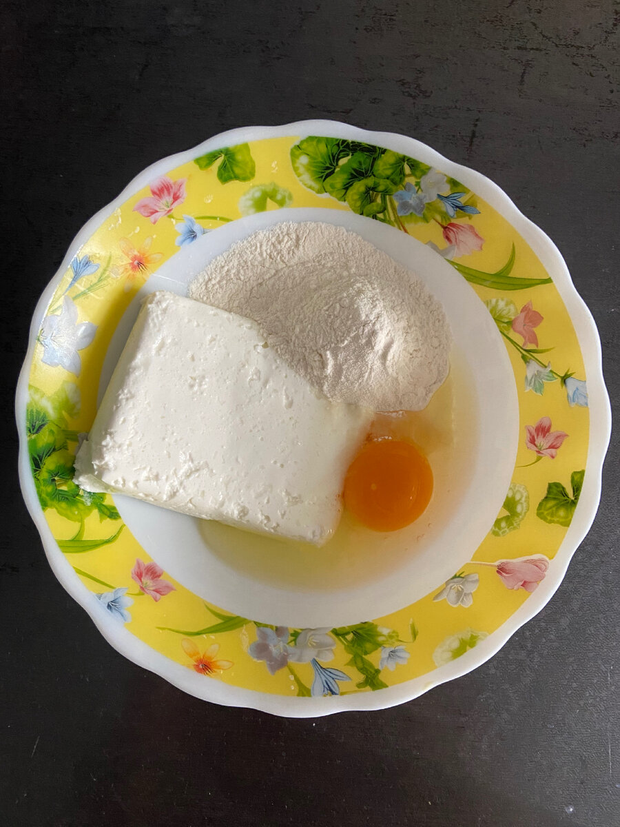 все что понадобиться: творог в брикете, яйцо, мука (35-45 Гр) и сахар по вкусу.