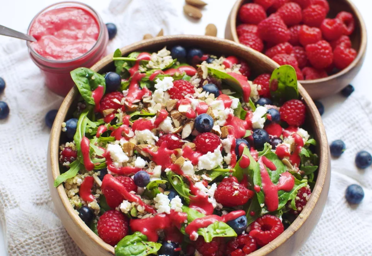 Малину и чернику вымойте и дайте стечь воде. Ягоды сложите вместе в чашку, добавьте измельчённую мяту, сок обоих цитрусовых и хорошо встряхните.