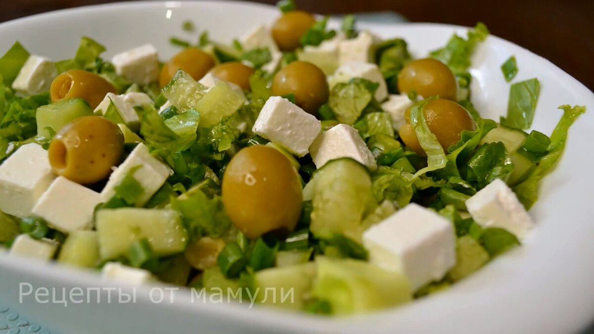 Хотите разнообразить своё меню, приготовьте этот салат. Вкус у него особенный, приятный! Нашей семье нравится, надеюсь понравится и вам! Приготовление начнем с нарезки зеленого лука. Мелко нарезаем его. Теперь листья салата. Их тоже нарежем. Хочу сказать, что в этот салат можно добавить любую зелень. Берем несколько свежих огурчиков. Нарезаем их произвольно средними кусочками. Соединяем лук, листья салата, огурцы. Добавляем сок лимона. После этого добавляем оливки. Сейчас салат можно посолить и заправить оливковым маслом. И последний штрих. Для этого салата нам понадобится брынза или сыр фета. Важно чтобы сыр имел слегка солоноватый вкус. Нарезаем брынзу кубиками. Добавляем сыр в салат, слегка перемешиваем и он готов. Готовьте с удовольствием и всем приятного аппетита! А вот и ингредиенты: Зелёный лук - 1 пучок Листья салата - 8 - 9 шт Огурцы - 4-5 шт Брынза - 150 гр Оливки - 150 гр Масло оливковое или растительное - 3 ст.л Сок лимона - 1 ст.л Соль по вкусу