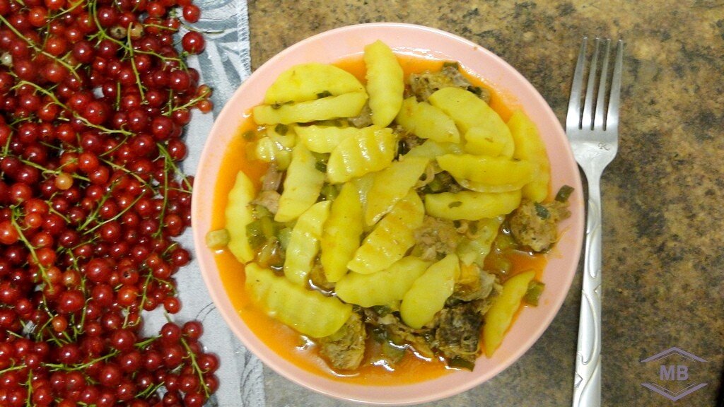 Картошка с тушёнкой в мультиварке - находка для полноценного, сытного и вкусного обеда с ужином! Привычное блюдо будет вкусным без проблем и хлопот! Ингредиенты: 6-10 клубней картофеля, 1 банка тушёнки свинины или говядины (можно микст), зелёный лук перьями, 1-2 шт солёных огурчика, 200 мл воды, 2 столовые ложки томатной пасты, 1 лавровый лист, 1-2 зубчика чеснока, соль, перец, специи и зелень - по вкусу. Процесс приготовления: Консервы тушёнки открываем и содержимое перекладываем на сковороду. К мясу отправляем порезанный лук. Обжариваем массу на среднем огне 3-5 минут. Затем добавляем солёный огурчик, порезанный кубиками или натёртый на тёрке. Обжариваем 3-5 минут. Очищенный картофель нарезаем соломкой. Эффектнее будет выглядеть готовое блюдо, если при нарезке картофеля использовать фигурный нож. В миске разводим томатную пасту с горячей водой. В чашу мультиварки высыпаем картошку, заливаем томатной водой и солим, перчим по вкусу. Перемешиваем, чтобы специи распределились равномерно