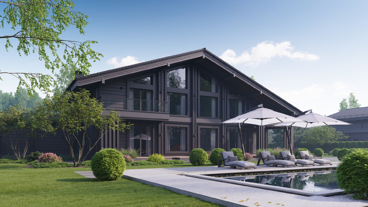 Наш новый проект «Аргос» получил название в честь древнего греческого города, ставшего родиной античных царей и героев. Этот двухэтажный дом, рассчитанный на семью из 4—5 человек, пронизан атмосферой силы и уверенности. Дом оформлен в стиле современного шале. Сочетание темно-серого дерева с декоративными каменными панелями придает фасадам брутальный вид. 3D-наличники подчеркивают строгую геометрию панорамных окон. А видовые стропила и декоративные перголы завершают образ. Кроме главного входа, мы предусмотрели и дополнительный – из гаража, откуда можно сразу попасть в удобную гардеробную. Рядом с гаражом расположена техническая зона. Планировка внутреннего пространства дома выполнена с учетом всех требований клиента. Так, на первом этаже расположена кухня-столовая с примыкающей к ней кладовой. Кухня визуально объединена с гостиной, оборудованной вторым светом. Рядом с ней находится бильярдная комната, имеющая выход на террасу. Помимо этого, на первом этаже есть общая ванная, прихожая,
