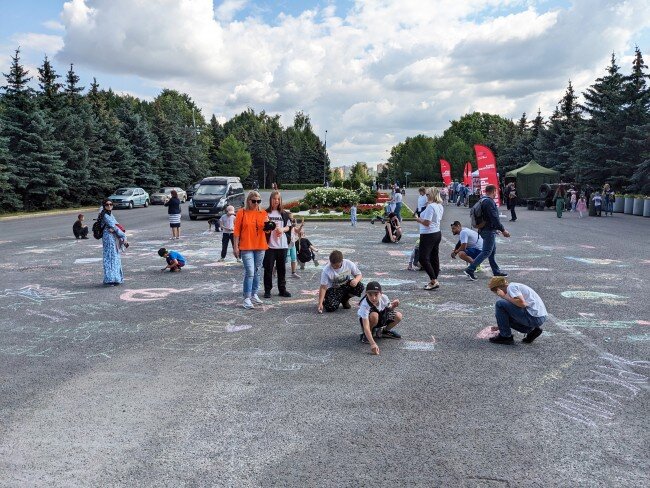 Начиная с 10 июня на Поклонной горе каждые выходные с 11:00 до 19:00 для взрослых и детей проходят масштабные бесплатные культурные мероприятия: экскурсии, мастер-классы, концерты, спортивные баталии и творческие соревнования. Новый проект семейного отдыха организован Музеем Победы. Специально ко Дню рисунка на асфальте, который в России отмечается 16 июля, здесь устроили флешмоб. Его участниками могли стать как дети, так и взрослые. Важное условие: все рисунки должны быть посвящены военно-патриотической тематике. «Погода замечательная, сопутствует празднику. Дети и взрослые могут взять мелки и нарисовать понравившийся им сюжет. Многие изображают флаг России, пишут патриотические слоганы: «За Победу». Приятно, что людей приходит много, рисуют целыми семьями, многие фотографируются», - рассказала организатор флешмоба София Артемова. «Мы гуляли по парку и увидели эту локацию. Дочка предложила порисовать. Замечательная инициатива, спасибо организаторам, я будто вернулась в детство», - дел