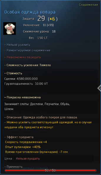 Для прокачки кулинарии нам понадобятся Особая одежда повара. Так устроено , что только она дает опыт ремесла. и плита которую нужно установить в доме. Дом можно купить за ОВ в любом городе. Бафы - слеза энта и ремесло наемника 150% Варить будем пиво. Рецепты пива на 1 повтор: 5 - злаков(кукуруза, ячмень, пшеница) - покупается на аукционе 6 - вода для готовки - у трактирщика 2 - дрожжи - у трактирщика 1 - сахар - у трактирщика Берем на 800 повторов: 4000/4800/1600/800. При забафе 250% - 30 минут и вы Эксперт 1 в кулинарии. Далее можно прикупить снаряжение покруче и заняться приготовлением различных блюд Закинуться бафами посерьезней Реликвии Сеслы и комбинации светящихся камней. Реликвии Сеслы - Опыт кулинарии +5% и Мастерство кулинарии +10 можно получить при занятии Имперской кулинарией (Делать сундуки повара и сдавать их Имперскому караванщику) и кайфовать пажизне. В шопе есть костюм кулинара. Его также можно приобрести на аукционе за серебро. Опыт профессии +15%, время приготовлен