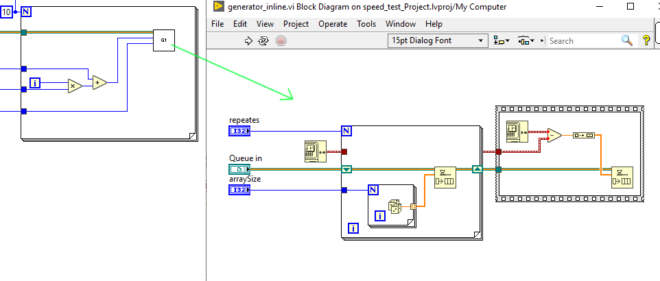 Коротко об Execution system В LabVIEW шесть потоков (систем исполнения): Базово функции исполняются в стандартном потоке, но, если нужно обновить индикатор, в дело вступает UI поток. А неприятное в этом то, что остальные части функции начинают подтормаживать. Вот тут интересный вопрос – а на сколько подтормаживать? Для тестов я выбрал упрощённую модель системы: Часть кода отвечает за сбор данных, а проще говоря, генератор случайных чисел создаёт массив заданной длины. Операция повторяется много раз, после чего в очередь отправляется время выполнения. Так же замечу, что очередь специально создаётся размером 1, так что поток «сбора данных» будет ждать, пока обработчик выполнит свою часть задачи. Это сделано для упрощения замеров времени. Сама начинка оформлена в виде subVI с режимом inline, что позволит использовать одинаковые функции в тестах, при этом без затрат времени на вызов функций. Второй участок кода отвечает за обработку. Чтобы нагрузить процессор, для каждой точки вычисляетс